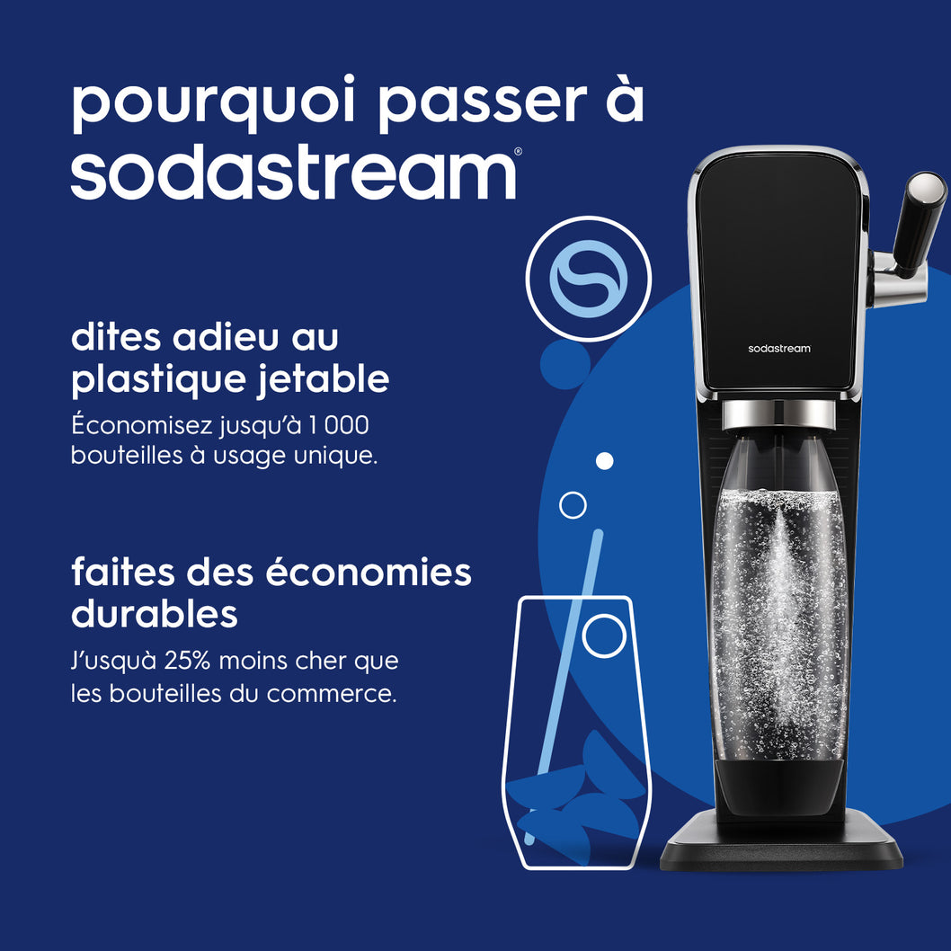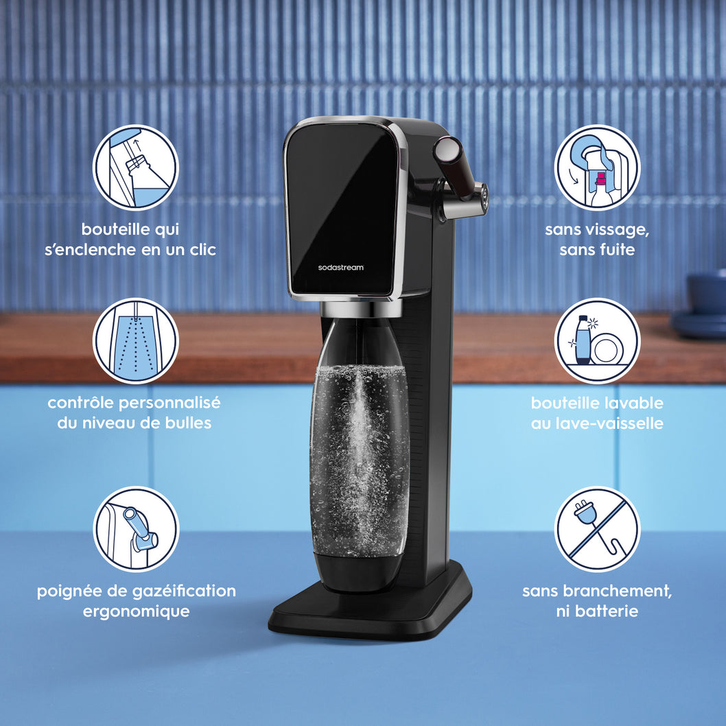 Sodastream Art - Préparer son eau pétillante est tout un Art. Cette machine aux lignes raffinées et au look vintage vous offrira une expérience unique grâce à son levier de gazéification ergonomique. Ses bouteilles sont compatibles lave-vaisselle et sa recharge de gaz. Quick Connect à clipser d’une simple main. Idéale pour les bartenders en herbe ou les plus aguerris !