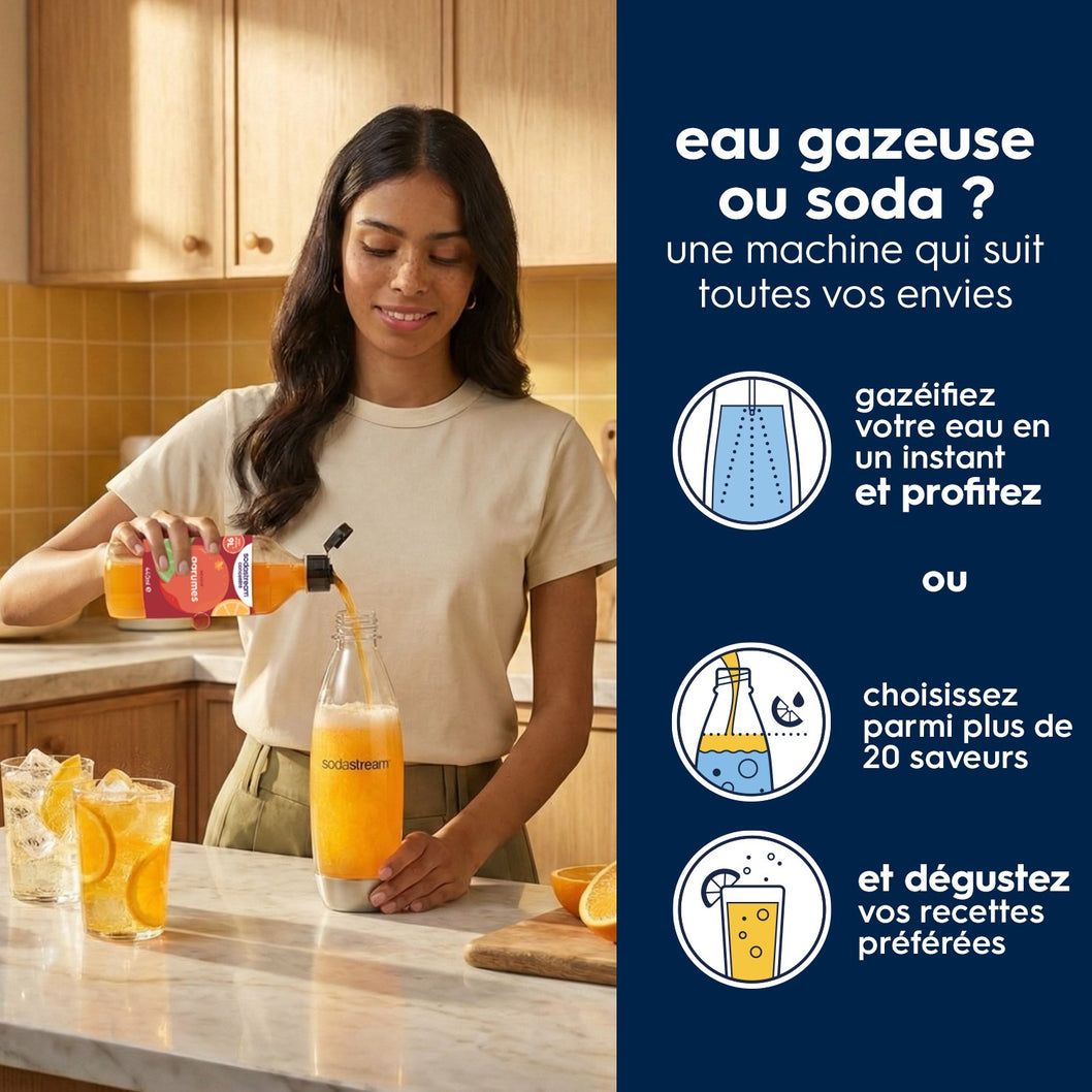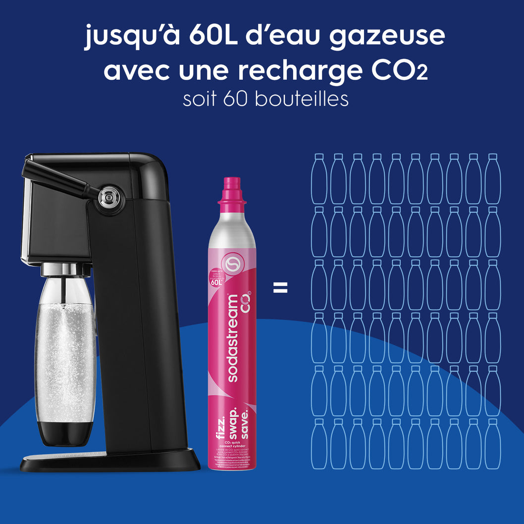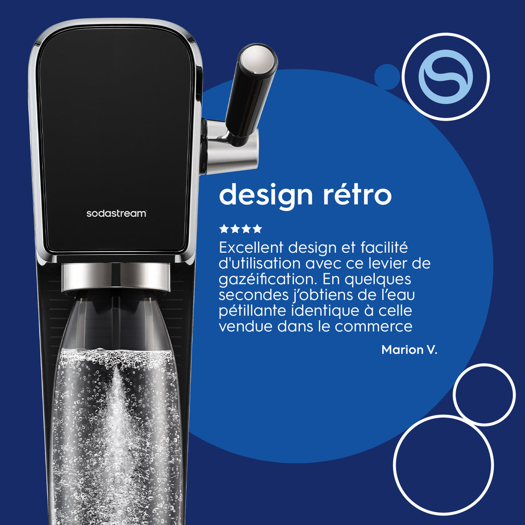 Équipée du système CO₂ Quick Connect à clipser et d’une bouteille compatible lave-vaisselle, la SodaStream ART® combine style vintage, simplicité d’utilisation et plaisir des boissons pétillantes au quotidien.