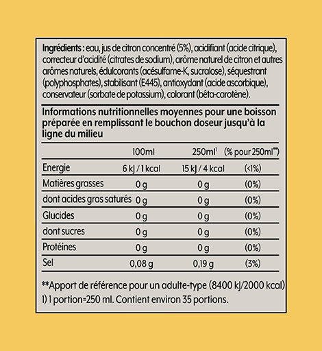 Transformez votre eau gazeuse en votre boisson citronnée préférée sans sucres ! La sensation vivifiante d'un citron fraîchement pressé. Idéal pour préparer une limonade avec une pointe d'acidité, à la fois rafraîchissante et désaltérante. Préparez votre eau pétillante avec le concentré de sirop de citron sans sucres SodaStream et la machine à eau gazeuse, puis ajoutez un bouchon doseur de concentré de sirop de citron sans sucre et savourez une délicieuse boisson pétillante.