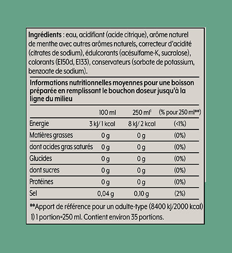 Transformez votre eau gazeuse en votre boisson à la menthe sans sucre préférée ! Notre sirop de menthe sans sucres offre un goût intemporel avec son parfum rafraîchissant et sa couleur vert vif. Parfait pour un diabolo menthe, mais aussi pour des mocktails comme le mojito virgin... Préparez votre eau pétillante avec la machine SodaStream, puis ajoutez un bouchon doseur de concentré et savourez une délicieuse boisson gazeuse sans les calories du sucre.