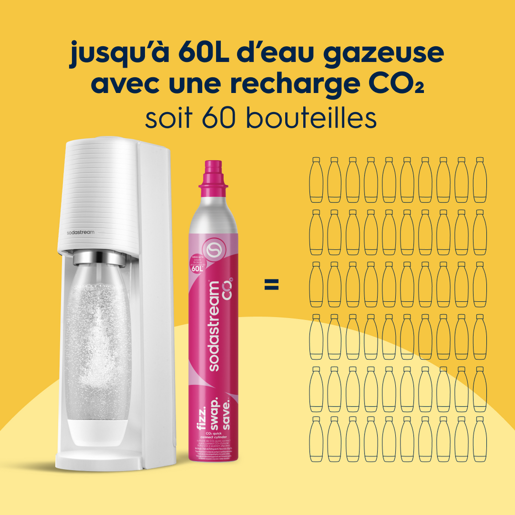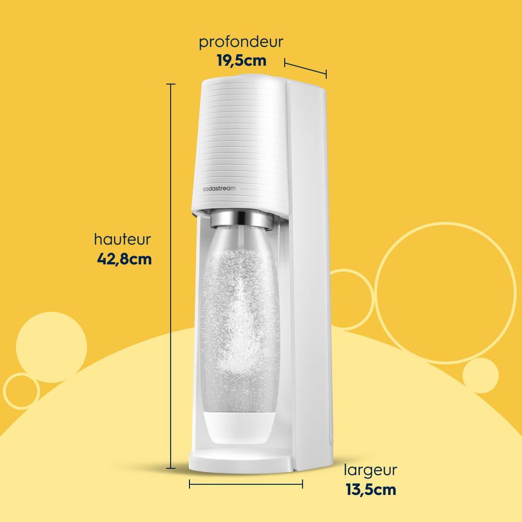 Avec son design compact aux finitions mates et sa simplicité d'utilisation, la machine à eau Gazeuse Sodastream Terra transformera votre eau du robinet en eau pétillante en quelques secondes ! Facile et intuitive, elle est livrée avec des bouteilles compatibles lave-vaisselle et sa recharge de gaz Quick Connect à clipser.